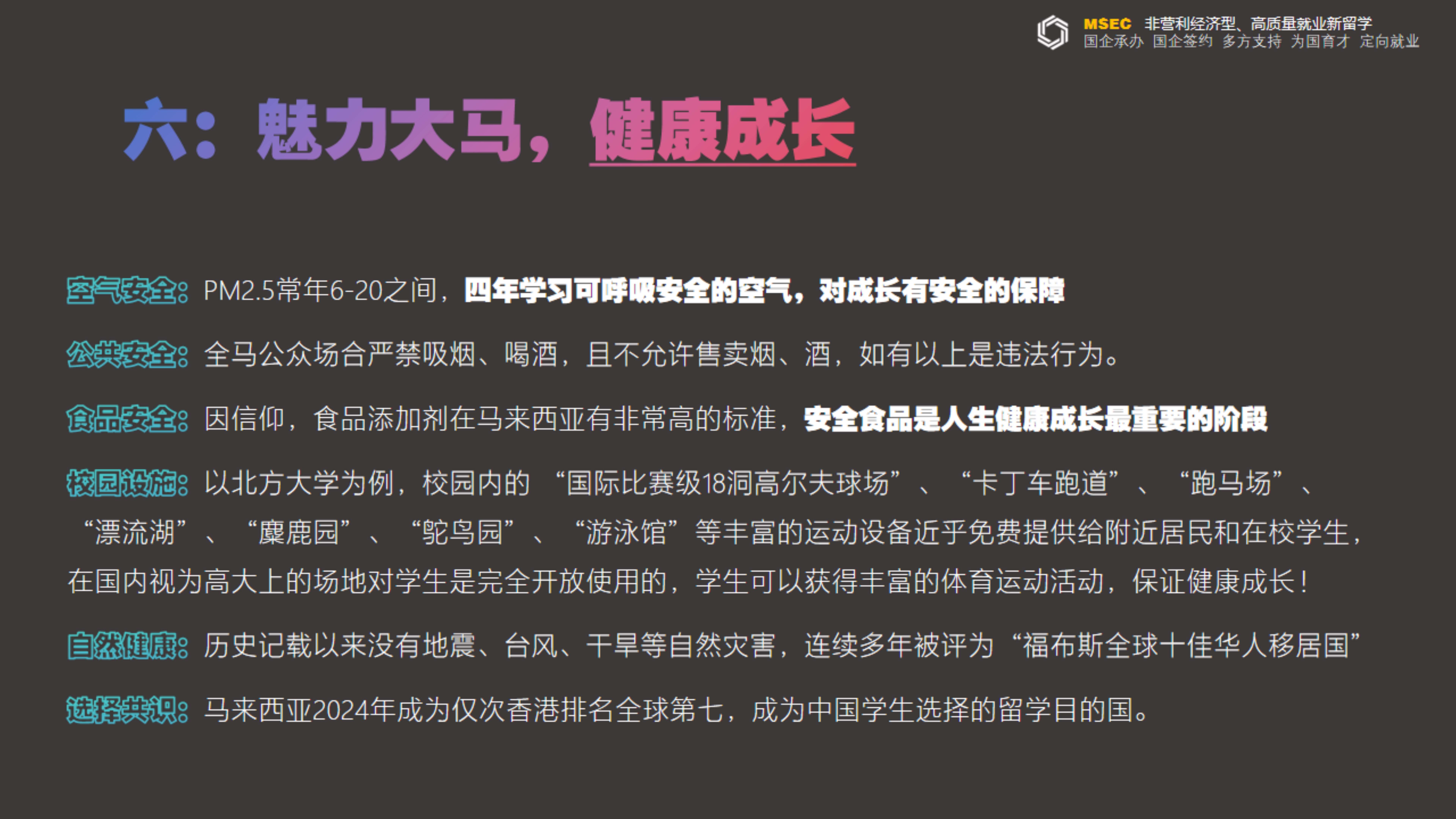 饮食安全: 因信仰,食品添加剂在马来西亚有非常高的标准,大马食品基本比较简单加工,很少售卖速成或预制菜等食品,18-25周岁身体成长期间长期使用安全食品是人生健康成长最重要的阶段。